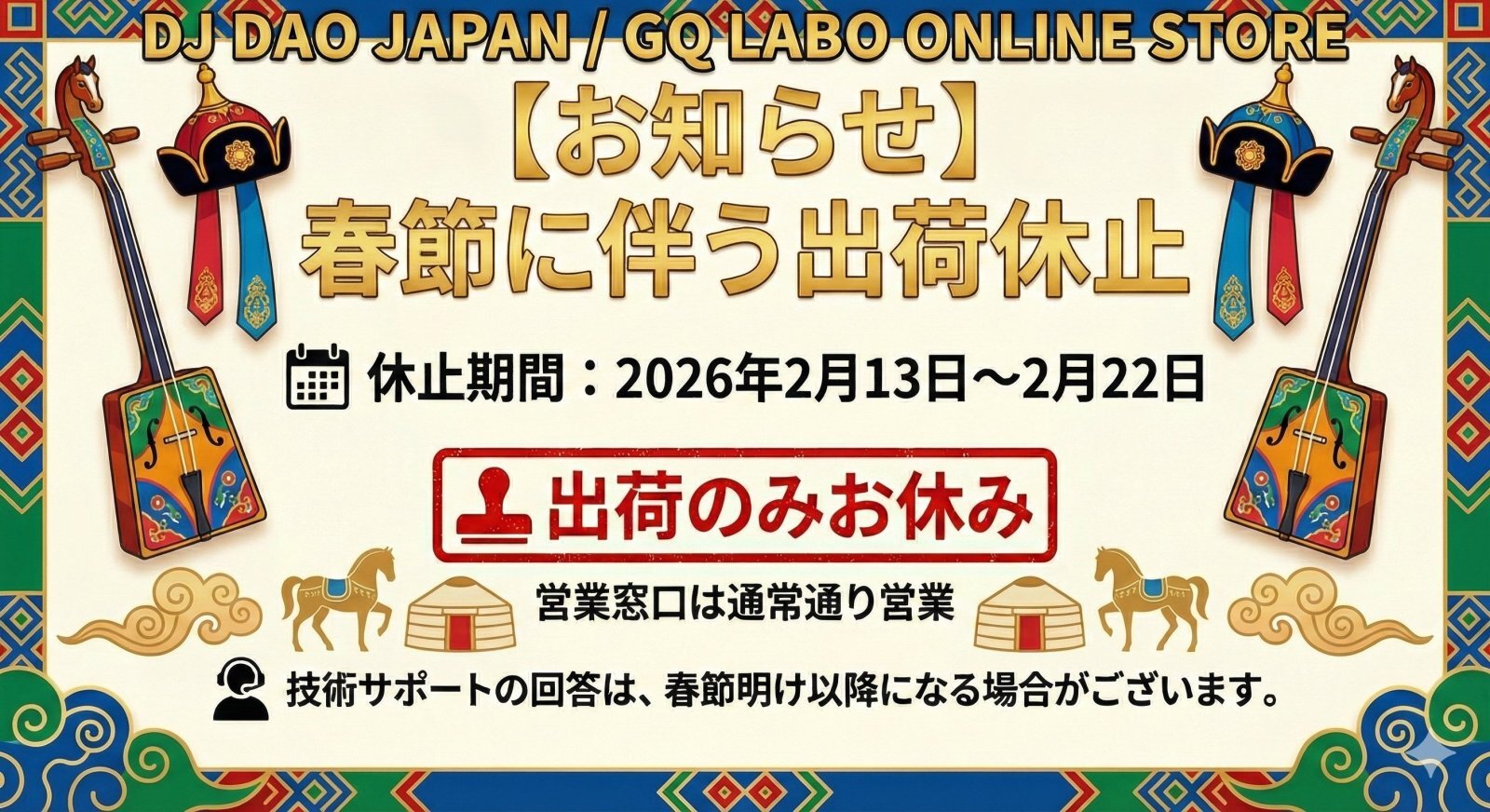 春節に伴う出荷業務休止のお知らせ